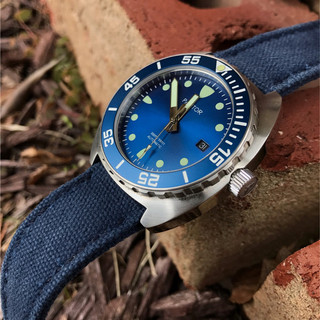 So I have gotten to wear the Sealion over the last week and thought I'd share some photos and my impressions. Thanks Luis for letting me test drive it I've only worn it on two of my DrunkArtStraps canvas straps. The watch is 42mm and 45mm L2L and 12.6 in thickness. It comes with either the Seiko NH35 at $329 or the Swiss ETA mvt at $549. The lume is superluminova C3 so it shines bright. Hour markers are painted on, no raised markers here. They nailed the blue dial. Truly a fantastic color and it looks super cool in the sun. The watch seems well made. The brushed and polished SS finish is on par with other Asian micros we all know and like such as Armida for example. I like the faceted hour and minute SS hands. They reflect the light nicely and add to the watch aesthetic. The bezel clicks precisely and lines up perfectly; the crown operates smoothly. I am a fan of the case style, it is not revolutionary I know and others have done a similar case whether Armida or Deaumar... but it works. Many are large but this one wears on the smaller side with its 45mm L2L so it is better suited for smaller wrists. For reference my wrist is about 7" and I think it wears well on me but I wouldn't want it any smaller. There is limited space for straps due to he short lug design. So you won't fit a thick strap but I was able to install two canvas on it without a shoehorn :) and they aren't thin either. I think it's a fine offering at a fair price for the preorder cost of $329. Cant really fault the watch in any way, it's well executed overall. I personally don't have interest in an eta for such a watch at 549. That becomes pricey and would rather get a Mido or certina diver or Alpina all available around that price from online grey dealers. Note it comes in green and black as well.